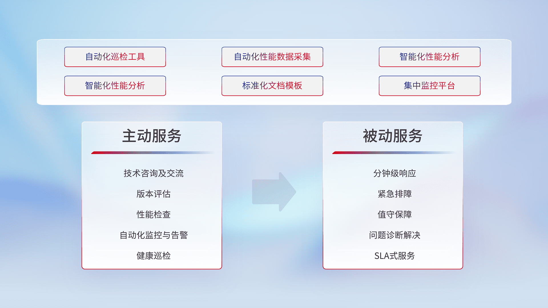 智能化工具和标准化文档,,,,保障服务质量,,提供主动服务(包含技术咨询、、版本评估、、、、性能检查、、自动化监控与告警、、、、健康巡检)和被动服务包含(分钟级响应、、、紧急排障、、、值守保障、、问题诊断解决、、、、SLA服务)。。
